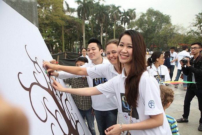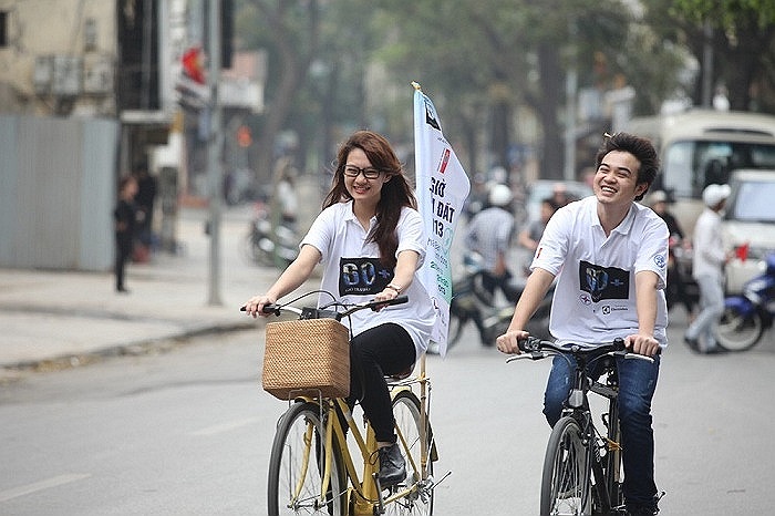 Ca sĩ Tùng Dương, Hoa hậu Dương Thùy Linh cùng hơn 300 bạn tình nguyện viên trong trang phục Giờ Trái Đất đã tham gia hoạt động đạp xe 'Chuyển động xanh' hôm 10/3.