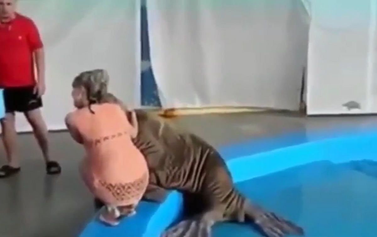 Sau khi chụp ảnh cùng người đẹp, hải cẩu bất ngờ vỗ vào vòng ba của cô khiến "nạn nhân" giật mình, la lớn.