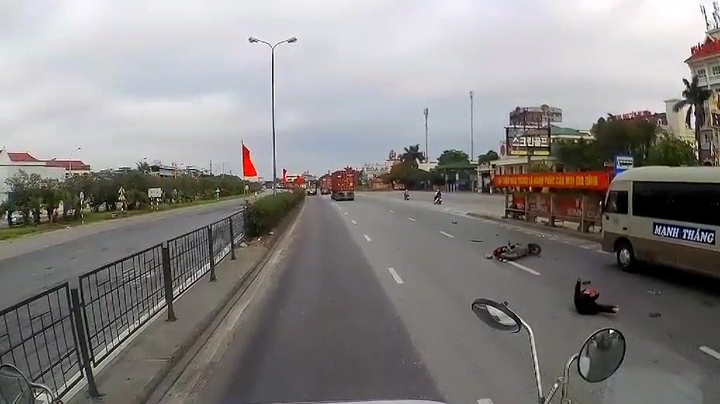 Người phụ nữ đi xe đạp trên quốc lộ 5, Hải Dương, va chạm với xe máy đi cùng chiều, bị ngã xuống đường, may mắn thoát chết trong gang tấc trước bánh xe container.