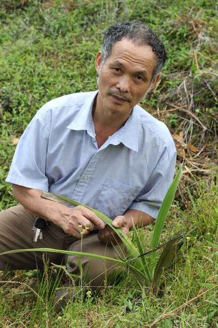 | Ông Lâm bên cây thuốc mà ông gọi là địa tàng thiên, do ông trồng ở Y Tý (Lào Cai), để lấy nguyên liệu sản xuất trà Trường Sinh Thang |