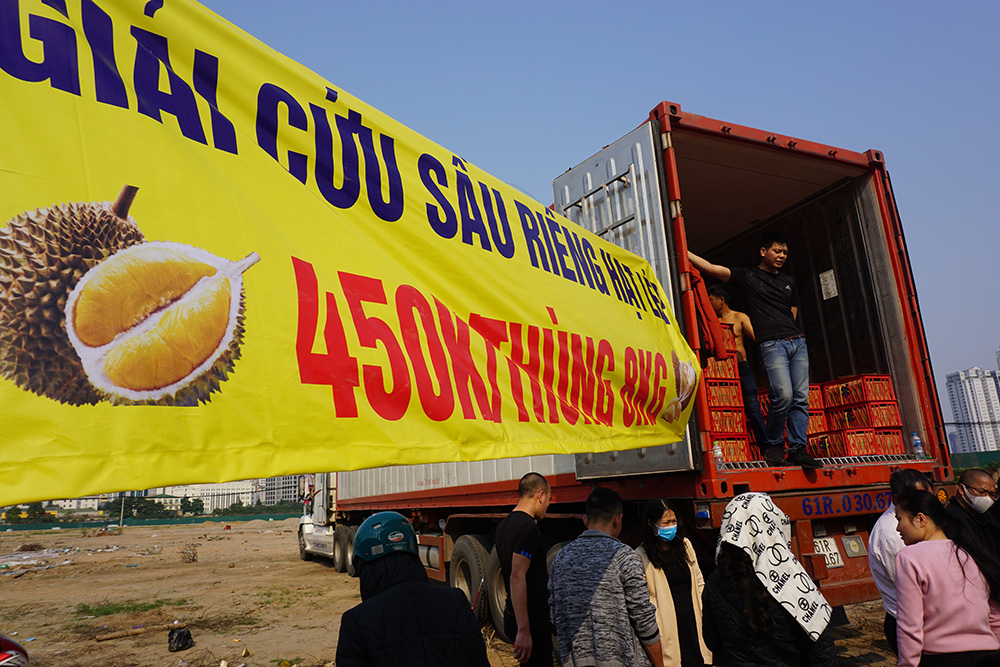 Chiều 18/2, một chủ xe container đã hạ hàng trên đường Phạm Hùng, Hà Nội để bán tháo số sầu riêng không xuất đi được Trung Quốc.