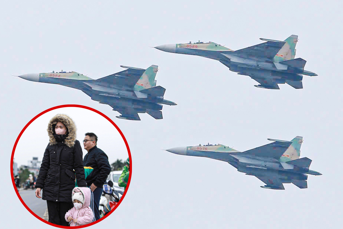 8h, trời lạnh 14 độ C nhưng em bé này vẫn được bố mẹ chở tới chờ chiêm ngưỡng máy bay chiến đấu của Việt Nam biễu diễn.