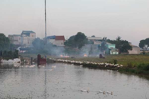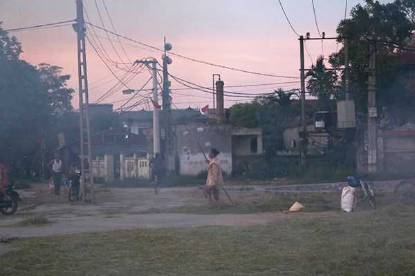 Khói rơm rạ tạo thành một lớp "sương độc" bao phủ lên các ngôi làng. Khói có tính cay, dễ gây các bệnh về đường hô hấp. Ảnh chụp tại thôn Vĩnh Trung (xã Đại Áng, huyện Thanh Trì, TP Hà Nội)