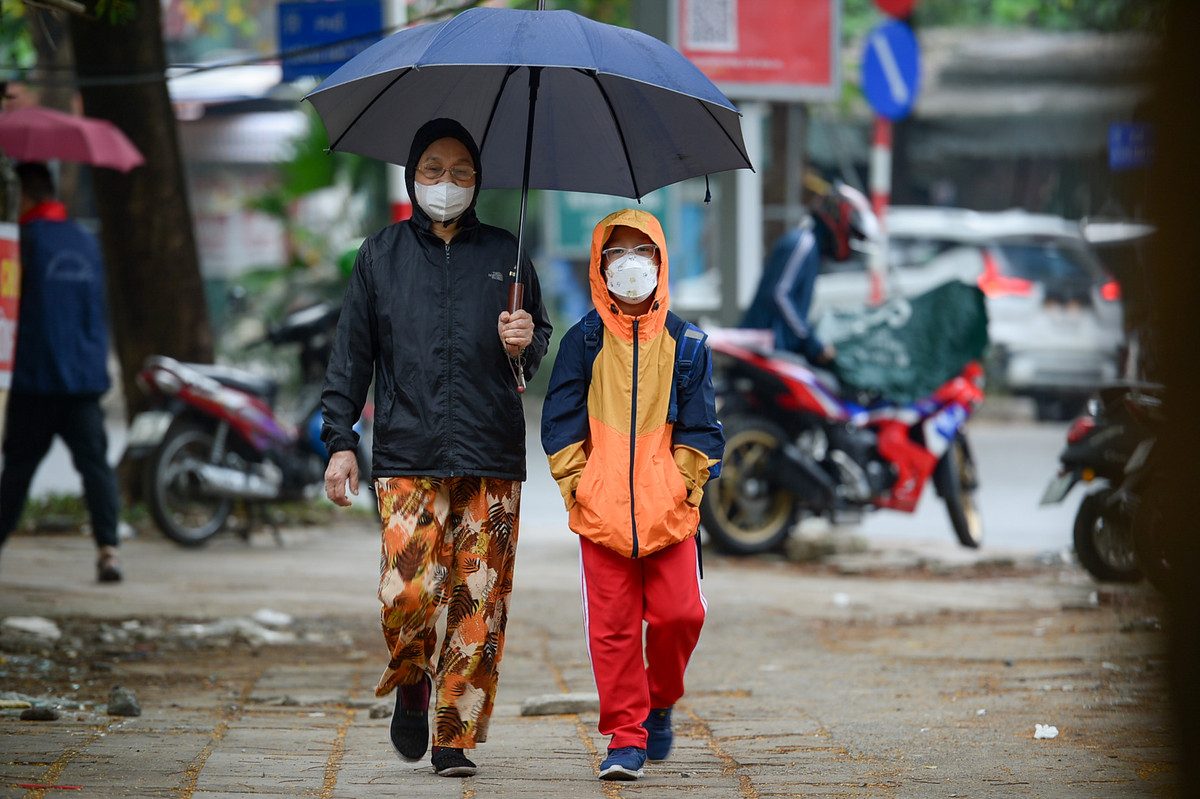 Người già, trẻ nhỏ mặc áo ấm khi ra đường.