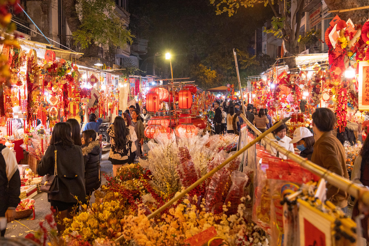 Chỉ còn hơn hai tuần nữa là đến Tết Nguyên đán Quý Mão, phố Hàng Mã đã ngập tràn trong sắc đỏ của mọi món đồ trang trí như đèn lồng, phong bao lì xì, hoa…cùng với dòng người nô nức đi mua sắm, tham quan không ngớt đến khuya.