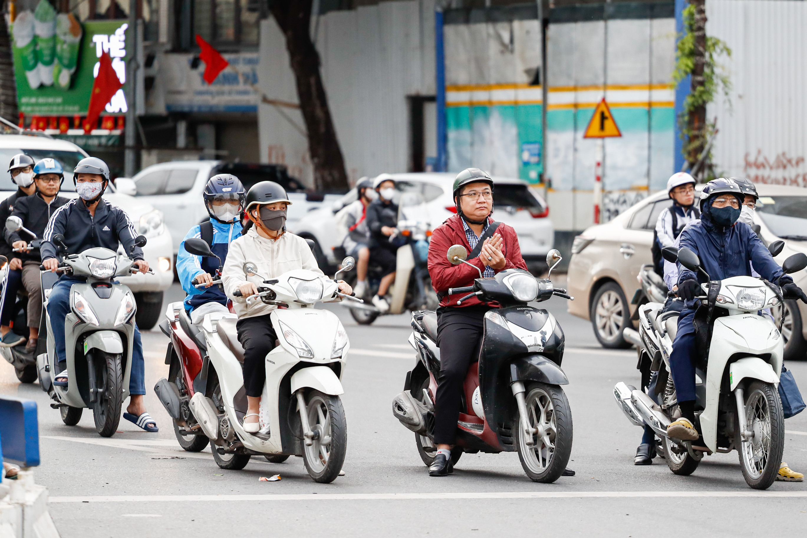 Nhiều người dân không kịp chuẩn bị áo khoác đã linh hoạt chọn giải pháp mặc áo mưa, áo chống nắng để tận dụng khả năng chắn gió khi di chuyển trên đường.