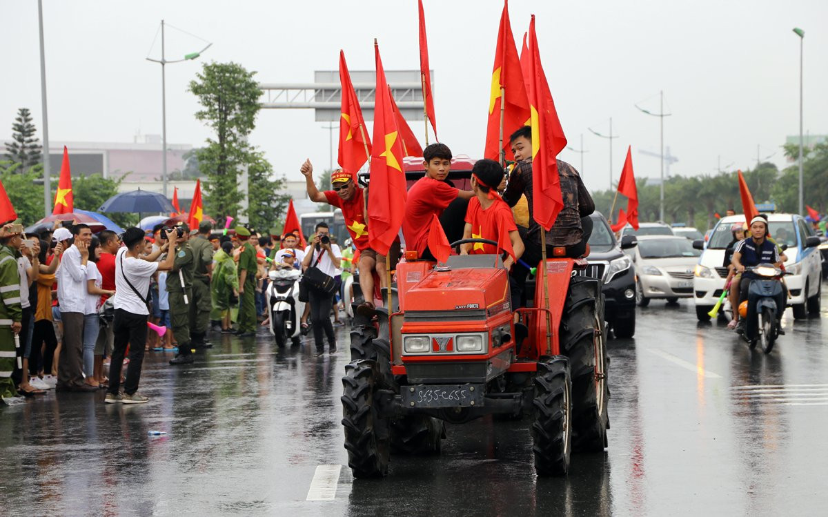 Các fan ngồi trên những chiếc máy cày đi chậm rãi, hô vang "Việt Nam vô địch!"