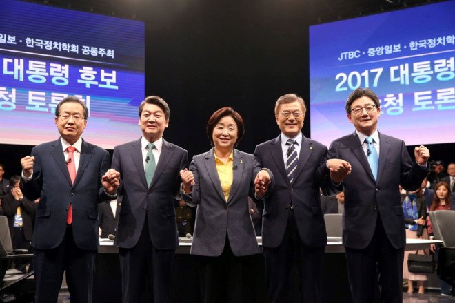 5 ứng viên tranh cử vào Nhà Xanh lần này, nhưng cuộc đua chính được cho là diễn ra giữa 2 ứng viên Moon Jae In của đảng Dân chủ và ông Ahn Cheol Soo của đảng Nhân dân.