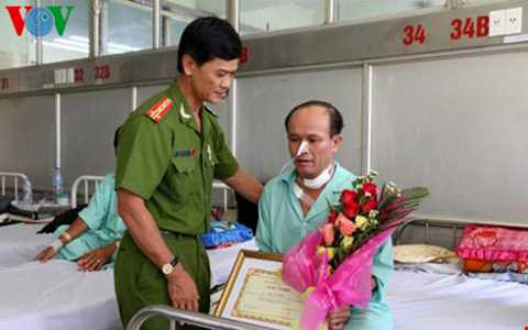 | Đại tá Võ Văn Phúc, Phó Giám đốc Công an tỉnh trao giấy khen và thưởng nóng cho ông Hải đang điều trị tại Bệnh viện Chợ Rẫy. Ảnh: Lê Ánh |