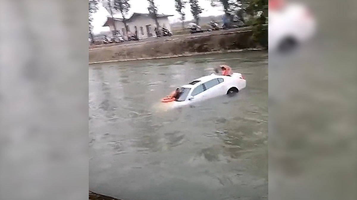 Hai người đàn ông dũng cảm đập vỡ cửa kính ô tô, giải cứu tài xế mắc kẹt sau khi chiếc xe lao xuống sông chảy xiết tại TP Thành Đô (Tứ Xuyên, Trung Quốc).