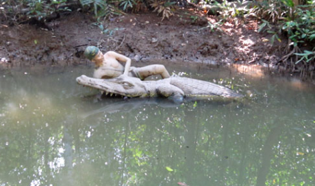 Hàng trăm người dân như khán giả đứng trên bờ, riêng ông Tám Ảnh cởi trần trùng trục với dây thừng khoác trên cổ lội ra kênh, vùng ngập nước tóm cá sấu. Ông Tám Ảnh có thể liều mạng lội vào giữa đàn cá sấu cả chục con để tóm con lớn nhất lôi lên bờ.