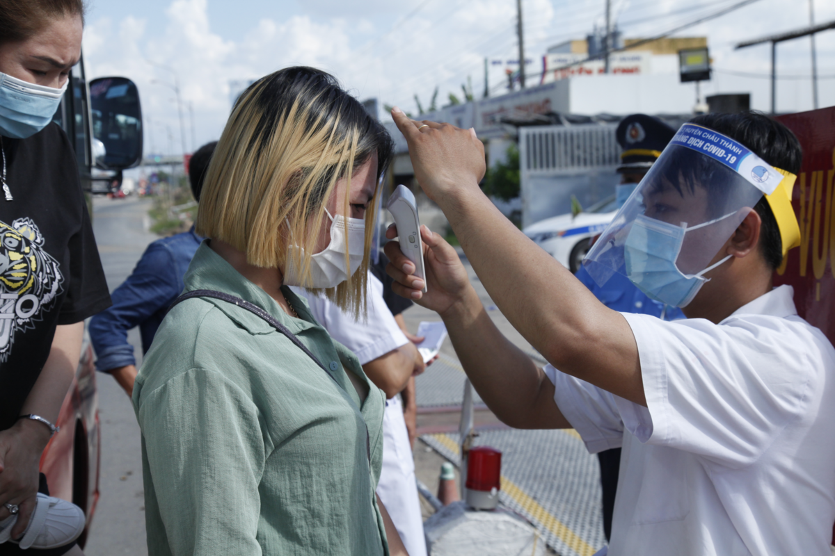 Đo thân nhiệt tại chốt kiểm soát dịch COVID-19 phía chân cầu Rạch Miễu, tỉnh Bến Tre. (Ảnh: Chu Huy)