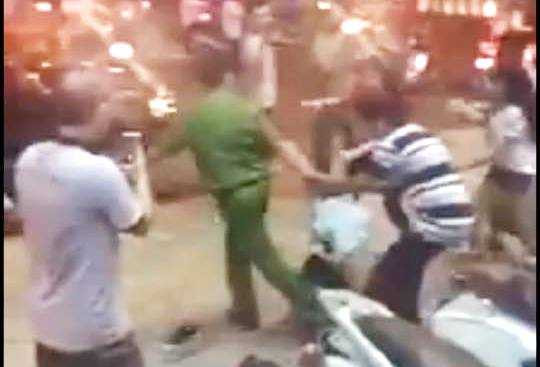 Trong đoạn video, người đàn ông mang sắc phục công an đang túm đầu tóc, ghì chặt một người phụ nữ không cho người này di chuyển.