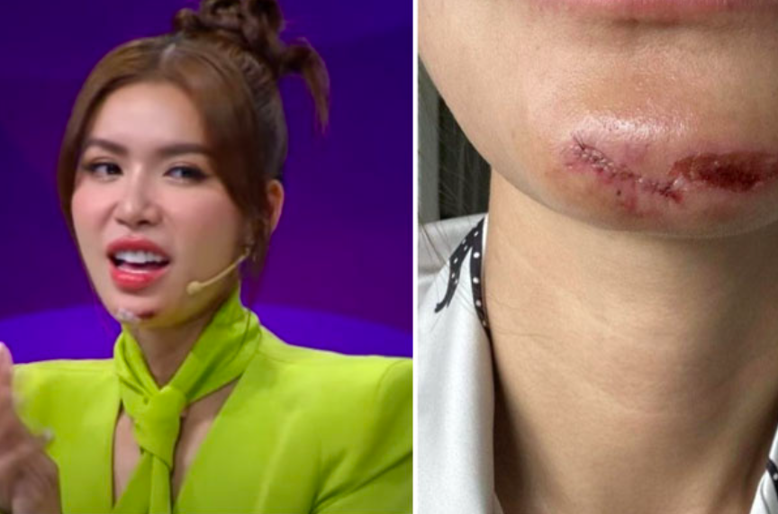 Minh Tú xuất hiện trên game show với vết thương dưới cằm.