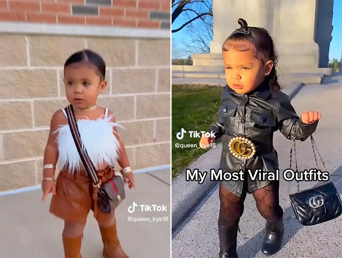 Theo đó, bé gái 2 tuổi được mẹ diện trang phục của các nhà mẫu tên tuổi như Chanel, Dior. Đa số trang phục của cô bé là những áo crop top, váy ngắn, quần áo bó sát... với chất liệu bằng da. Các phụ kiện kết hợp thường là những món lấp lánh, tất lưới.