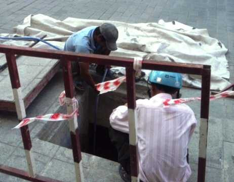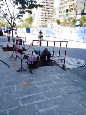 | Sau tai nạn bất ngờ, đơn vị thi công đã cho nhân viên đậy nắp hố ga |