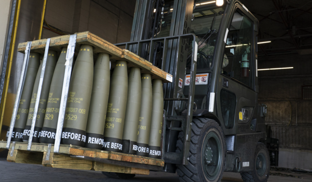 Một lô đạn pháo viện trợ cho Ukraine được chuẩn bị tại Căn cứ Không quân Dover, Delaware, Mỹ. (Ảnh: AP)