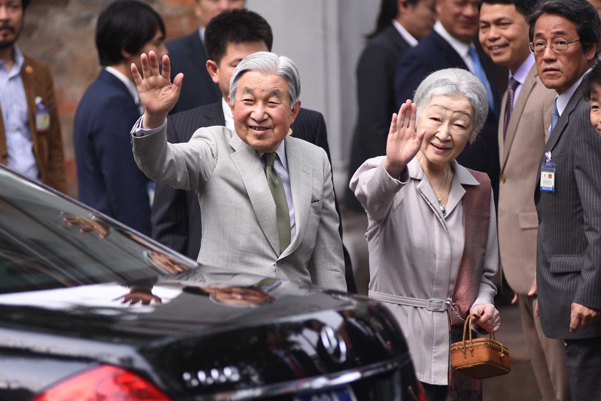Nhà vua và Hoàng hậu Nhật Bản vẫy tay chào đám đông ở Văn Miếu sáng 2/3. (Ảnh: Tùng Đinh)