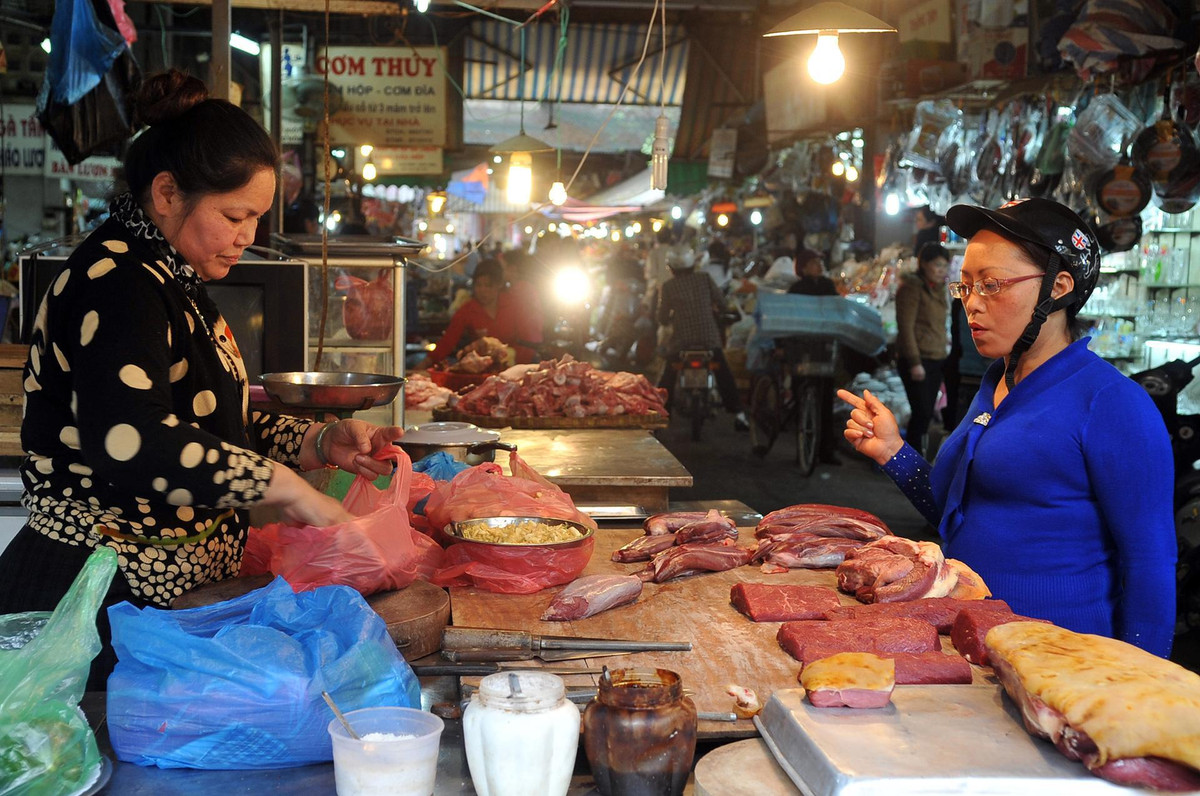 Không chỉ có rau củ quả, mặt hàng thịt cũng đã tăng giá tại các chợ. (Ảnh: Nam Khánh)