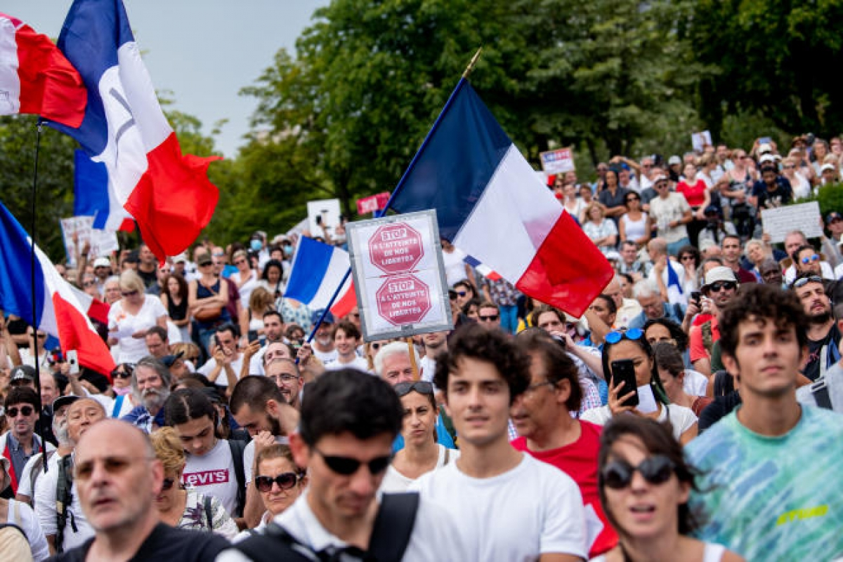 Những người biểu tình đã tụ tập trong nhiều giờ, hô vang các khẩu hiệu và giương cao biểu ngữ chống quy định về “giấy thông hành y tế” do chính phủ Pháp mới ban hành, đồng thời chỉ trích các hành động gần đây của Tổng thống Pháp Emmanuel Macron là ngày càng có xu hướng độc đoán.