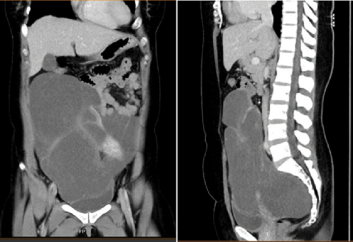 Qua thăm khám kết hợp với siêu âm, chụp CT, bác sĩ phát hiện chị A. có khối u rất lớn, chiếm hết 2/3 ổ bụng, chèn ép ruột, bọng đái, tử cung, buồng trứng, vách chậu và xương cùng lại len vào giữa xương cùng và trực tràng.