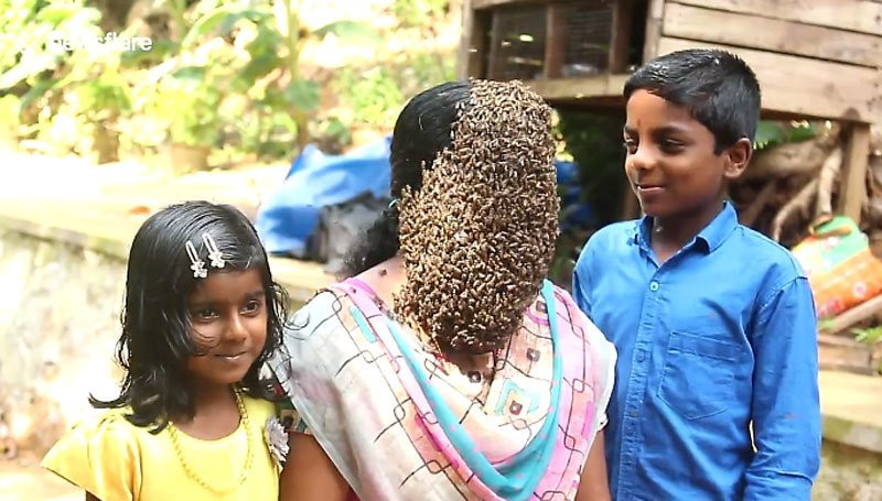 Cảnh tượng cả đàn ong bu kín mặt người phụ nữ được ghi lại ở Kerala, miền nam Ấn Độ. Cô thản nhiên để ong bu như vậy trước mặt hai đứa con còn nhỏ khiến người xem sợ hãi, bởi chỉ một sơ suất nhỏ có thể gây nguy hiểm cho cả ba mẹ con. Tuy nhiên, người phụ nữ này tỏ ra rất tự tin.