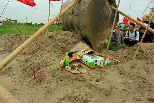 | Sau khi máy xúc cán vào người bà Châm, người dân nghĩ nạn nhân đã chết nên cắm hương tại hiện trường - Ảnh: V.N.K |