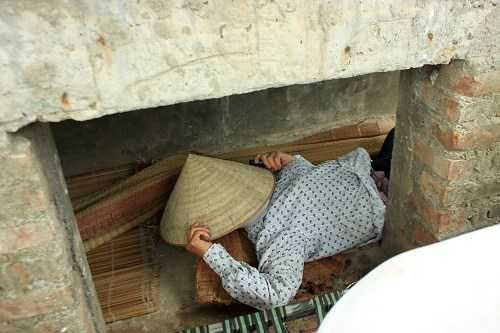 | Một người dân ngủ trong gầm cổng chào khu công nghiệp - Ảnh: V.N.K |