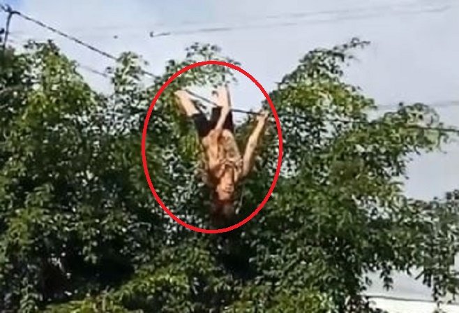 Sự việc người phụ nữ trèo lên trên dây điện đánh đu khiến nhiều người đi đường khiếp hoảng.
