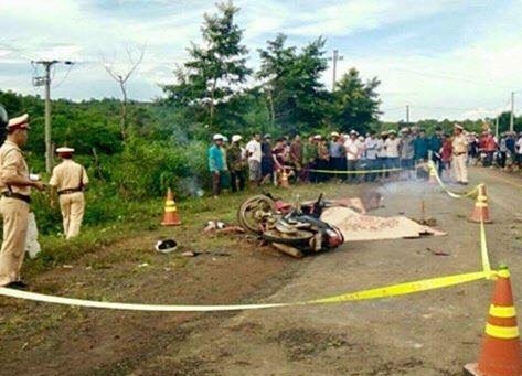 Cú tông mạnh khiến 2 nạn nhân tử vong tại chỗ. Tại hiện trường xe gắn máy hư hỏng nặng, nhiều bộ phận vỡ nát rơi vãi khắp mặt đường.