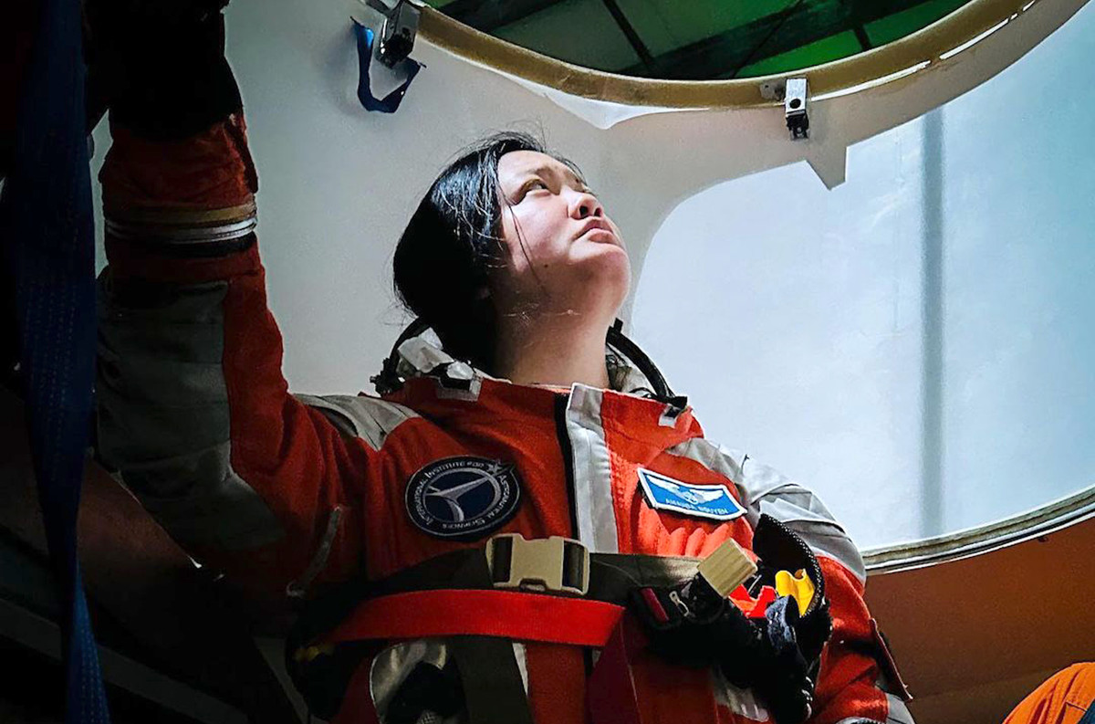 Amanda trong buổi tập luyện cùng bộ đồ phi hành gia.