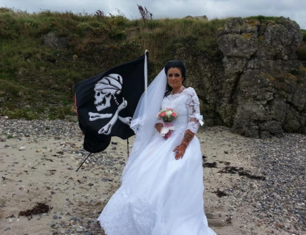 Amanda sử dụng một lá cờ đầu lâu xương chéo để đại diện cho Jack, trong khi bản thân khoác lên mình chiếc váy cưới hệt như một cô dâu. “Hôn lễ” còn có sự tham gia của 12 người thân và bạn bè của cô.