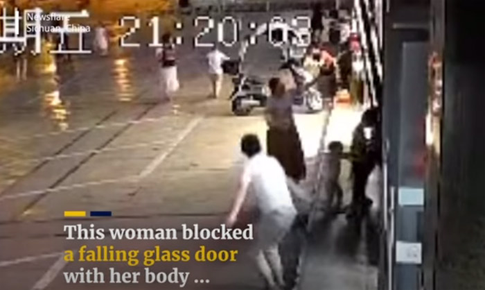Một phụ nữ tên là Jiang Yan ở Tứ Xuyên vừa cứu nhóm trẻ khỏi cái chết khi lấy tay đỡ cả cánh cửa kính bất ngờ đổ ập xuống chỗ họ đứng. Trước đó, chị nhắc mấy đứa trẻ không được đụng vào cánh cửa, vừa dứt lời thì thấy nó rơi xuống. Không một giây suy nghĩ, Jiang Yan lấy tay đỡ cánh cửa để các bé khỏi bị nguy hiểm.