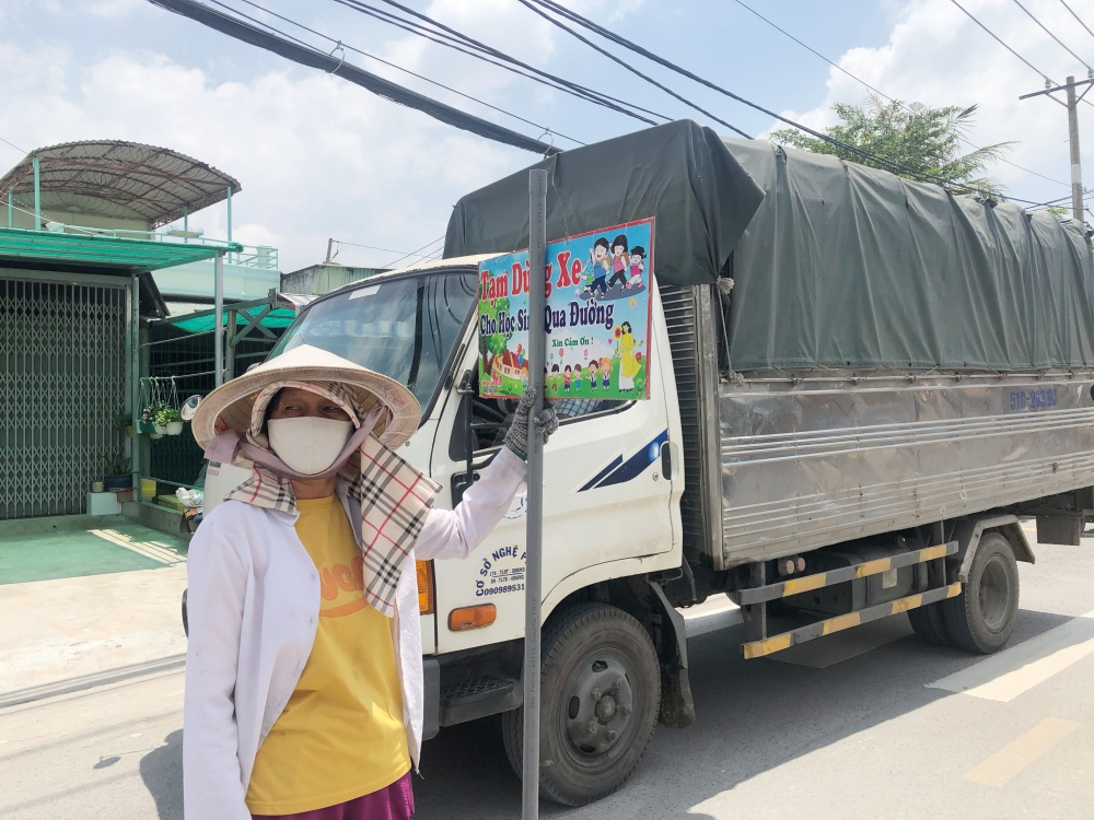 Hơn 7 tháng qua, người dân huyện Bình Chánh, TP.HCM quen thuộc với hình ảnh của bà Nguyễn Thị Bạch Phượng (62 tuổi, ngụ huyện Bình Chánh) hàng ngày cầm tấm bảng ghi dòng chữ “Tạm dừng xe cho học sinh qua đường” ra đứng giữa dòng xe cộ đông đúc.