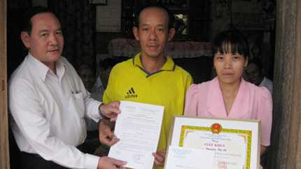 | Ông Nguyễn Hồng Sơn - Phó chủ tịch UBND huyện Giồng Trôm (Bến Tre) - tặng giấy khen cho chị Út. Ảnh: Trần Thanh |