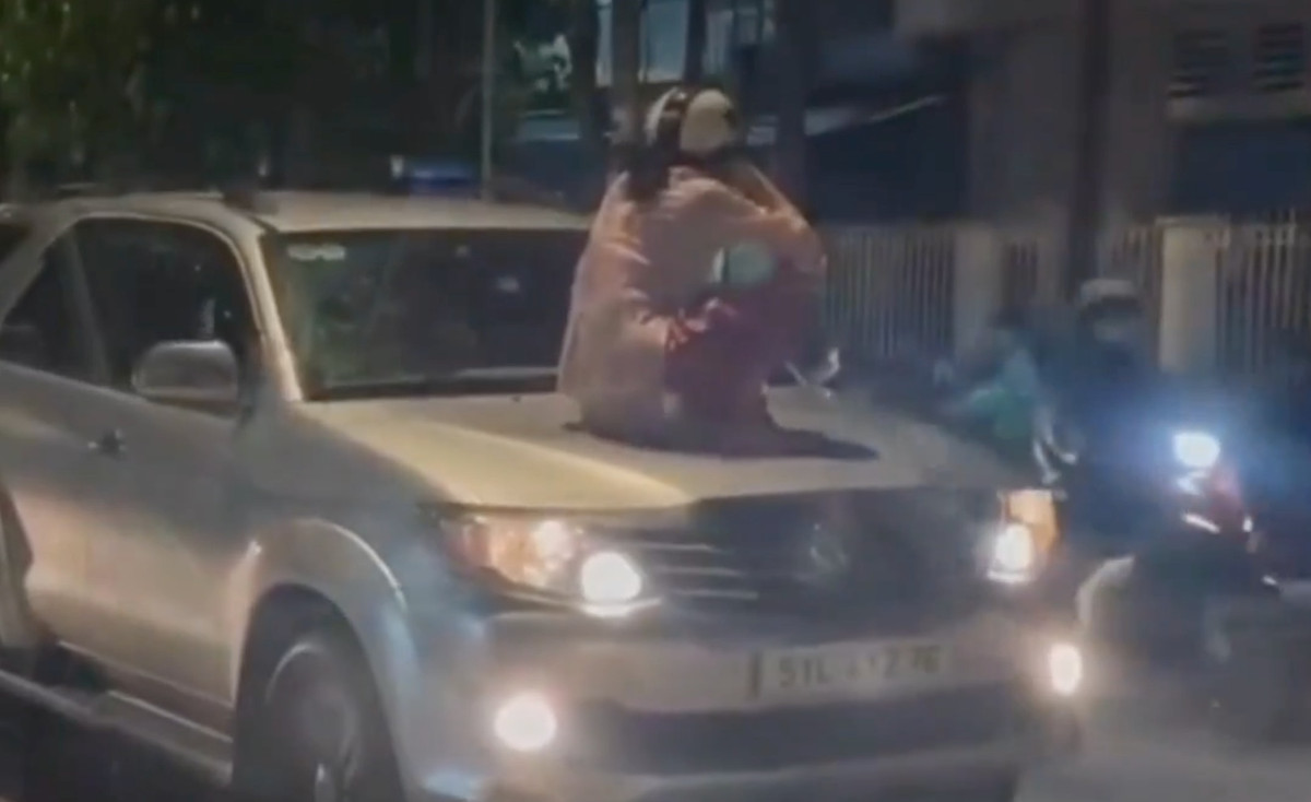 Trước đó, vào tối 6/9, mạng xã hội chia sẻ đoạn clip ghi lại cảnh một người phụ nữ trung niên đội mũ bảo hiểm sau khi đứng đầu ô tô biển số TP.HCM, nói chuyện qua lại với một người đàn ông thì bất ngờ leo lên nắp capo.