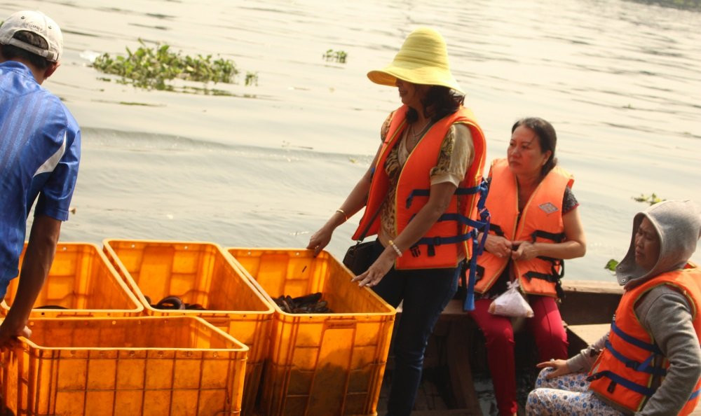 Để đảm bảo số cá không bị vớt lại, người phụ nữ này cùng gia đinh thuê thuyền ra giữa dòng để thả.