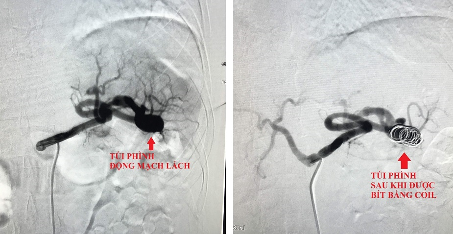 Hình ảnh chụp của máy DSA túi phình động mạch lách trước và sau khi được bit. (Ảnh: BSCC)