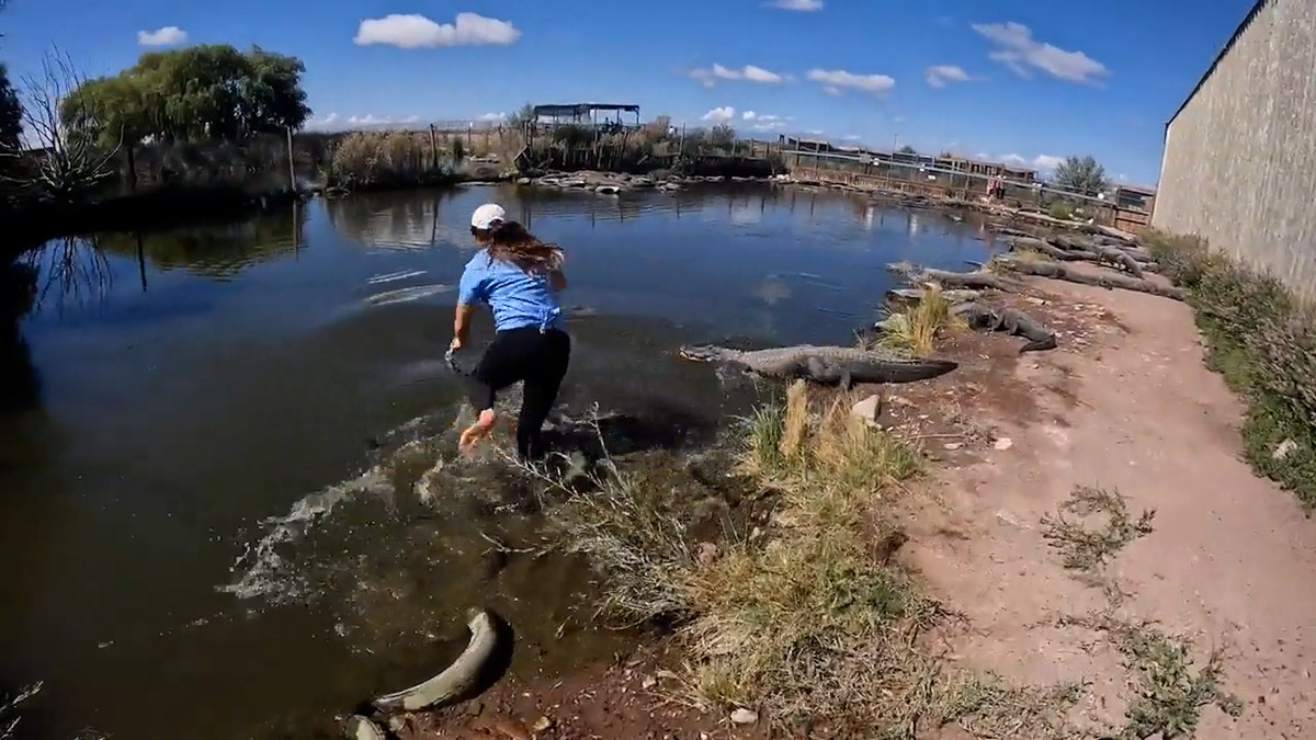 Cô gái trẻ lao xuống hồ đầy cá sấu, dùng tay không bắt một con rồi thoăn thoắt trói lại lôi lên bờ; cô là tình nguyện viên Khu bảo tồn cá sấu Colorado ở Alamosa, Mỹ.