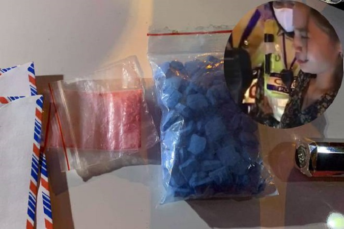 Nghi người phụ nữ giấu hàng cấm, Cảnh sát hình sự yêu cầu khám túi xách thì tìm thấy 2 gói chứa 97 viên nén và tinh thể giống ma túy.