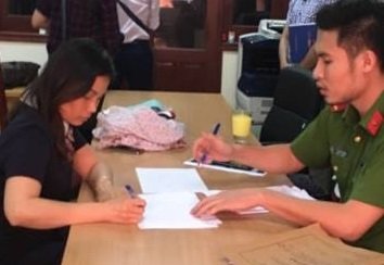Người phụ nữ có hành vi lăng mạ CSGT đang viết lời khai tại cơ quan công an.