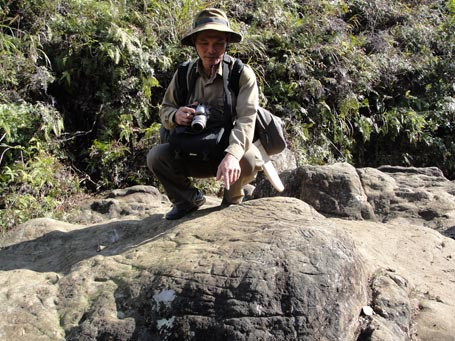 | Ông Trần Ngọc Lâm bên một tảng đá ở bãi đá có hình khắc chưa từng được biết đến trong rừng Hoàng Liên Sơn |