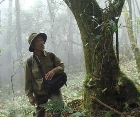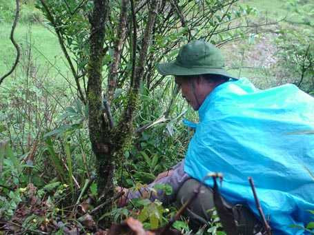 | Ông Lâm bên một gốc chè ngàn năm trên độ cao 2.800m, ngay dưới đỉnh Fansipan |