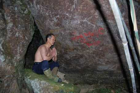 Sau khi đã lấy đủ thuốc, “người rừng” Trần Ngọc Lâm dẫn tôi cuốc bộ ngược hướng đỉnh Fansipan tìm đến cái hang, nơi ông sinh sống và tu thiền suốt mấy năm trời. Đó là cái hang đá nông choèn, chỉ đủ cho một người nằm. Ông Lâm phải dựng một cái mái lá để che mưa khỏi hắt vào trong hang.