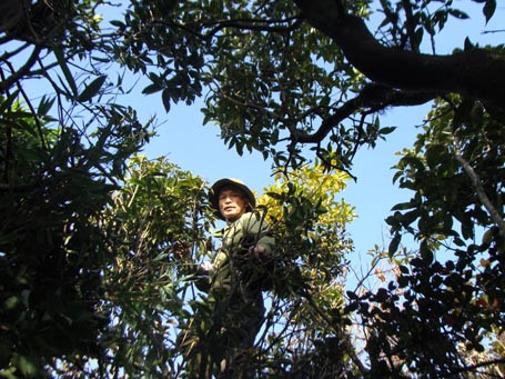 | Thi thoảng ông Lâm lại trèo lên ngọn cây để tìm bầy khỉ |