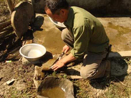Phía tay phải ông có chiếc vòng luân xa quay quay, bên trái có đống gạch và trước mặt là chiếc chậu bằng đất nung có mấy đồng tệ mệnh giá nhỏ và những gói thuốc bột chiết xuất từ lá cây.