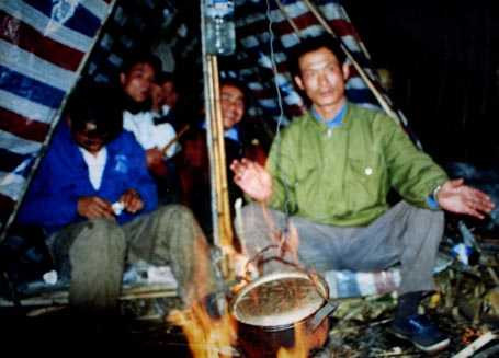 | Ông Lâm kể chuyện Hoàng Liên Sơn cho khách leo Fan trong túp lều giữa rừng |