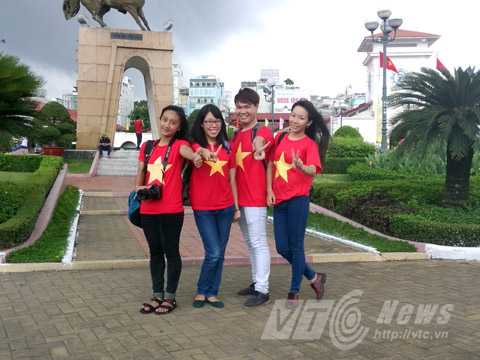 | Các bạn trẻ mặc áo mang biểu tượng Quốc kỳ Việt Nam trong dịp lễ 30/4 trước chợ Bến Thành, Q.1. Ảnh: Huy Phan |