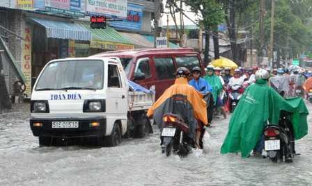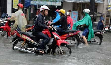 Tại một số tuyến đường trên địa bàn như Nguyễn Văn Quá quận 12, đường Cây Trâm, Lê Văn Thọ, Lê Đức Thọ quận Gò Vấp bị ngập sâu hơn nửa bánh xe, nhiều phương tiện chết máy phải dắt bộ.