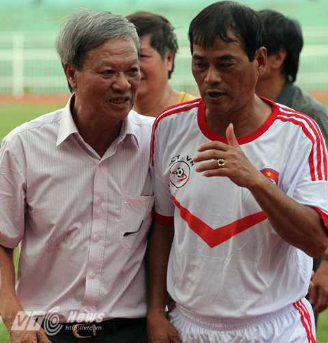 | Cựu tiền vệ của đội Tổng cục đường sắt Lê Thụy Hải gặp lại đồng đội xưa (Ảnh: Hoàng Tùng) |